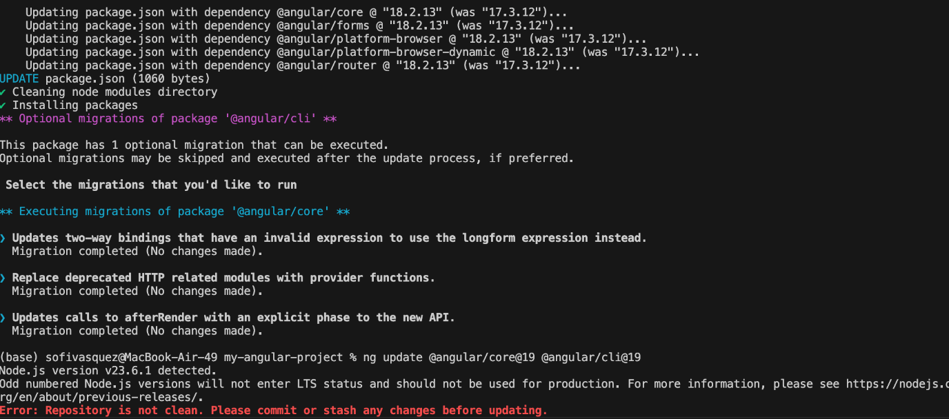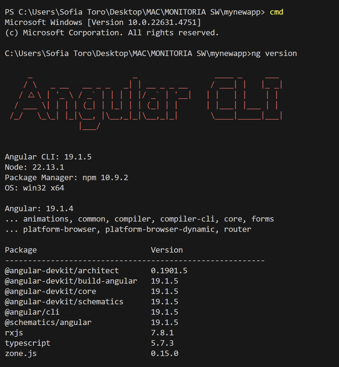 En esta parte, nos vamos a enfocar en actualizar la versión de Angular por si no se encuentra con la versión Angular CLI versioned 19.1.4.