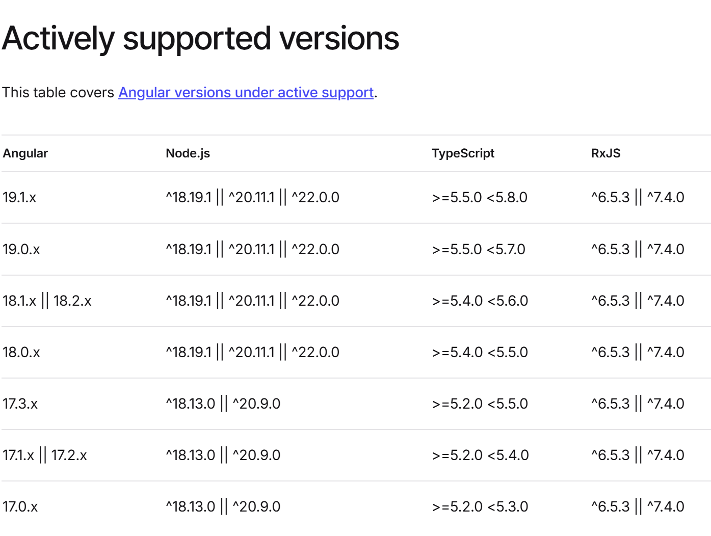 Suponiendo que ya tiene instalado Node.js, revise la siguiente tabla y asegúrese de tener una versión compatible con la última versión de Angular. De lo contrario, instalelo con el siguiente link: