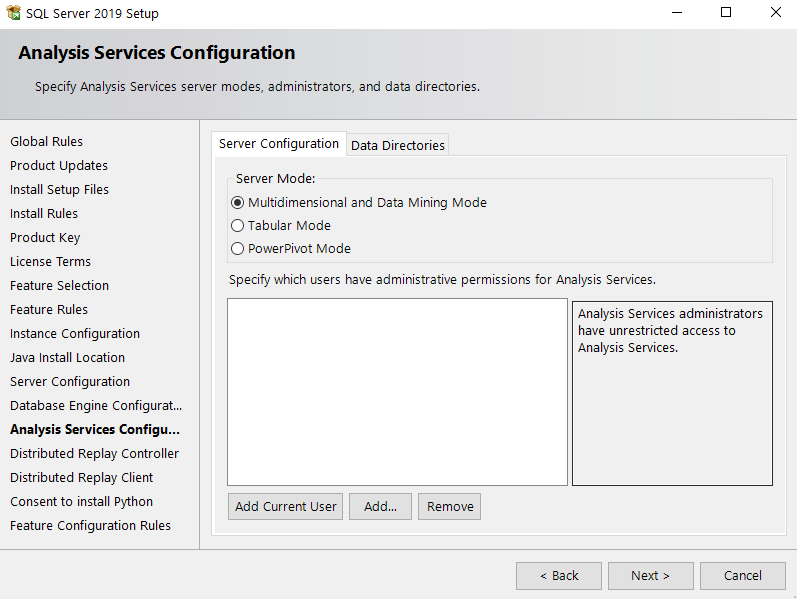 Seleccione el modo Multidimensional para la configuración de los servicios de análisis, este paso es necesario para la conexión con Excel en los análisis OLAP.