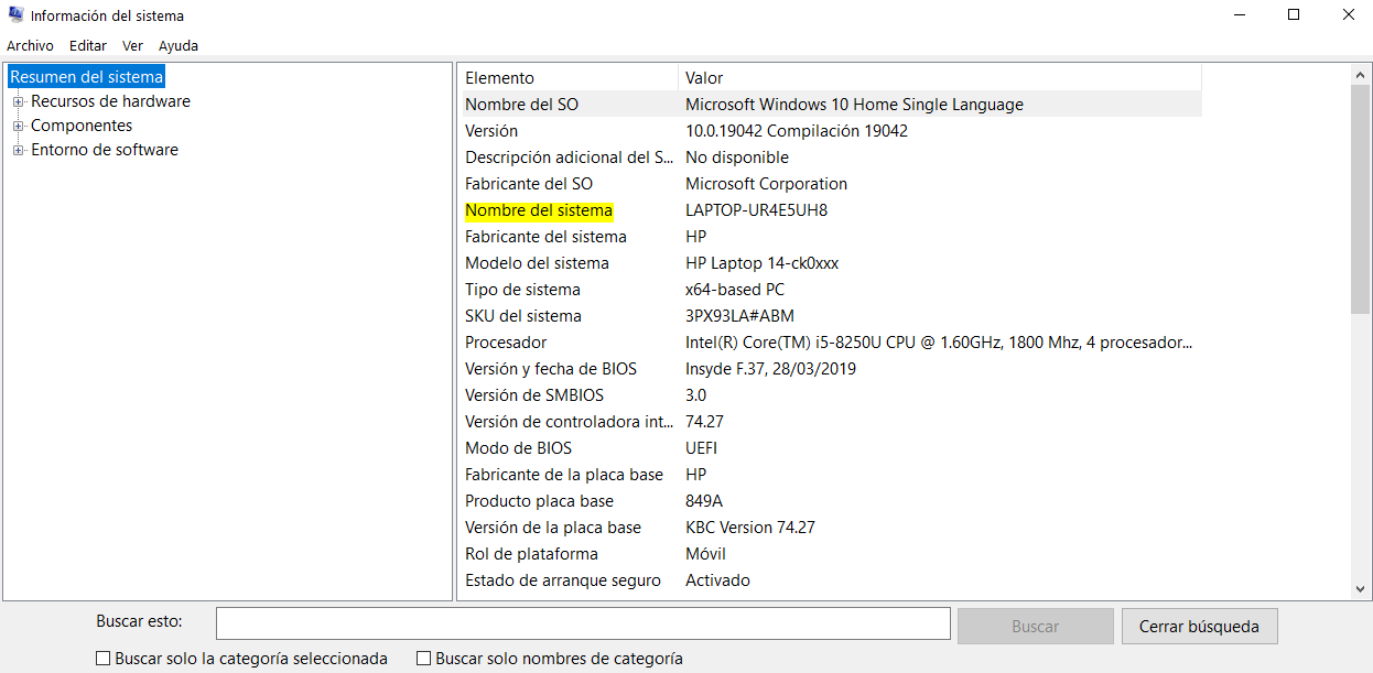 Abra Microsoft SQL Server management studio, use las credenciales que asignó en la instalación de Sql Server para conectarse, el nombre del servidor es el nombre del sistema que puede encontrar buscando en su máquina "Información del sistema"