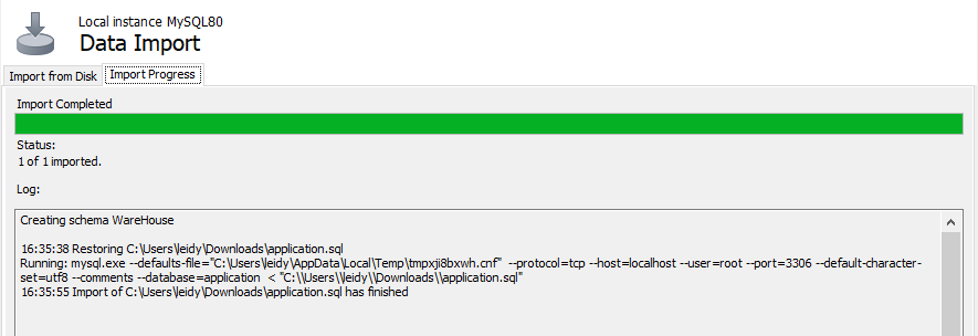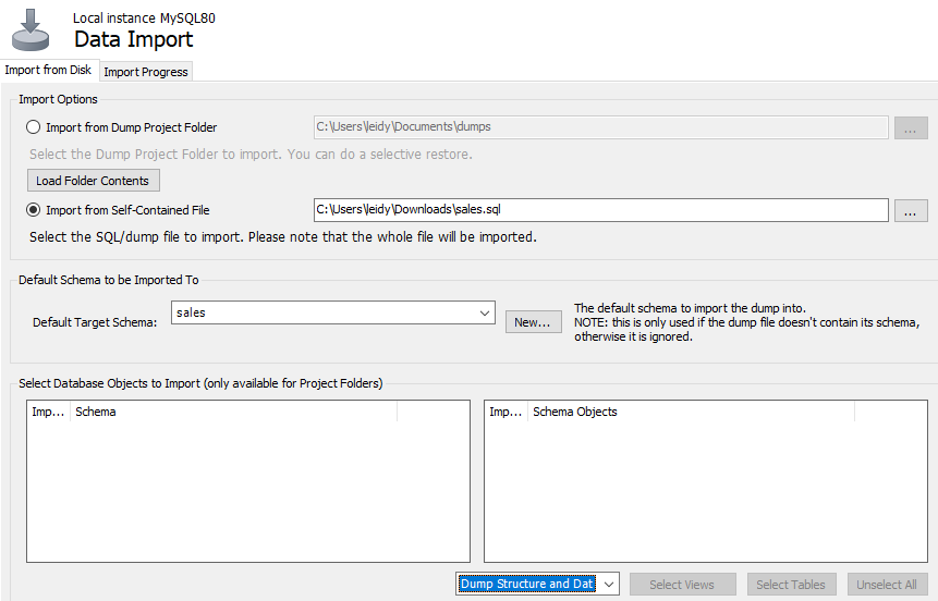 El botón para iniciar el importe puede no aparecer, en ese caso de clic en Dump Structure and Data, tab y enter