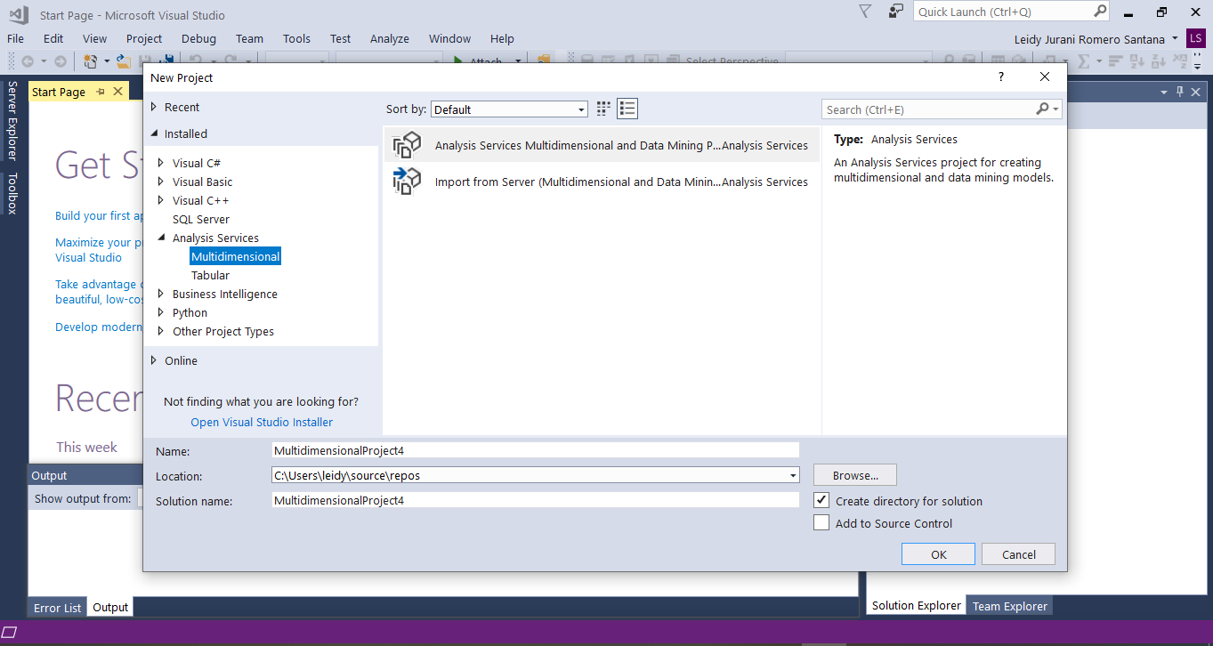 Si instalo Visual Studio 2019, abra la aplicación y diríjase en el menú superior a Extensiones->Administrar extensiones. Busque y descargue la extensión "Microsoft Analysis Services Projects"