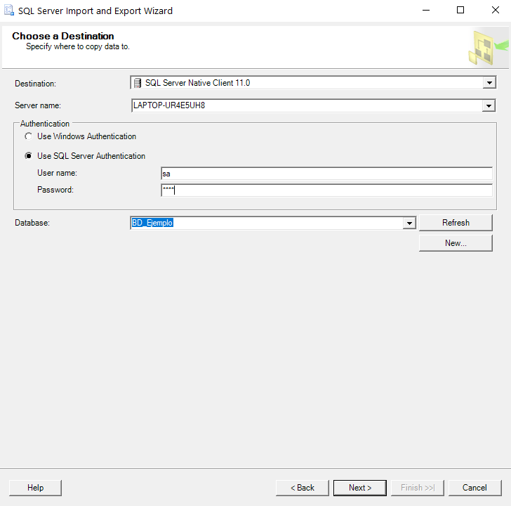 Como destino elija SQL Server native client, elija el servidor, ingrese las credenciales de autenticación y elija la base de datos destino
