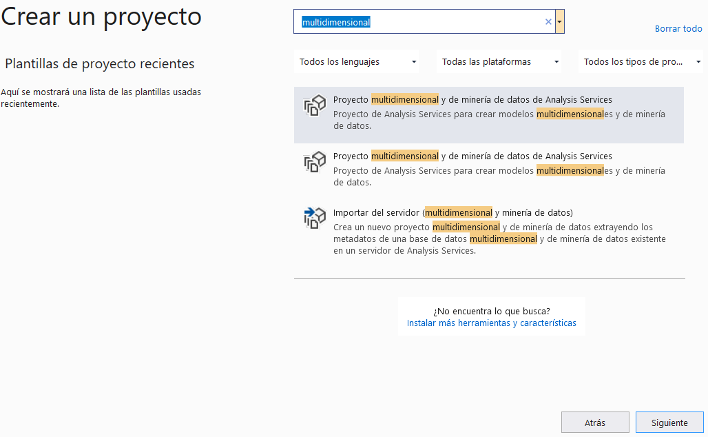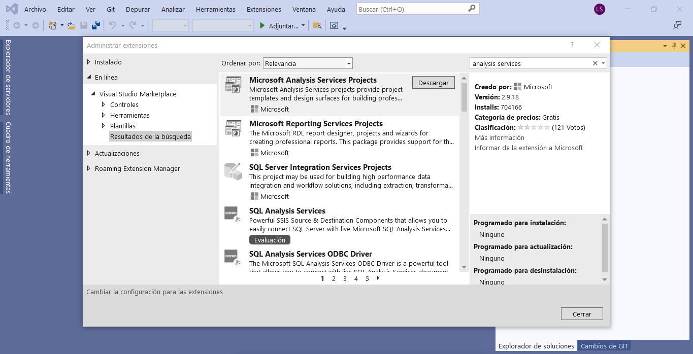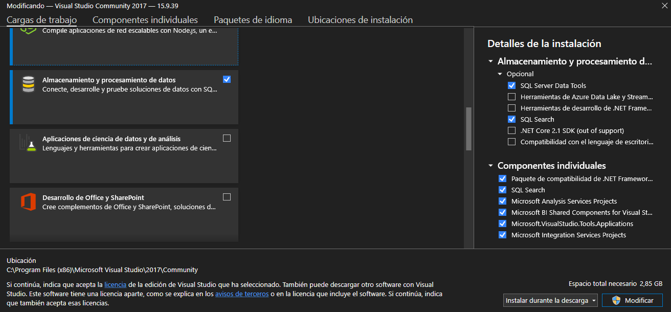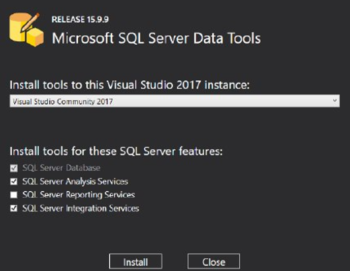 En el proceso de instalación asegúrese de instalar SQL Server Data Tools y Microsoft Analysis Services Projects como se muestra en la siguiente imagen