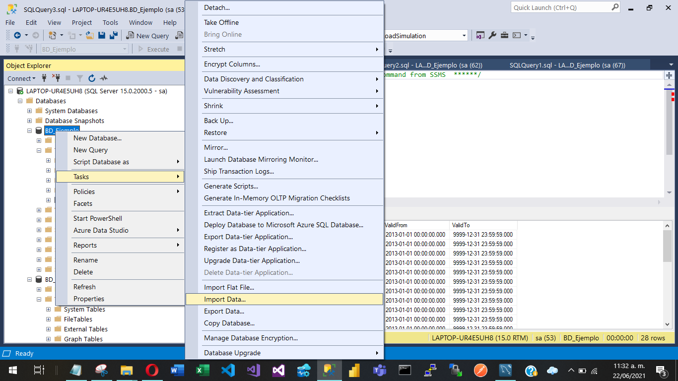 Luego despliegue las opciones dando clic derecho sobre la base de datos, seleccione Tasks->Import Flat File