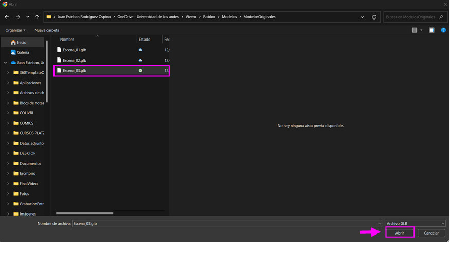 - Se nos abrirá una ventana de Explorador de Archivos. Aquí buscaremos y seleccionaremos el modelo base que descargamos. Seguido de esto daremos click en "Abrir".