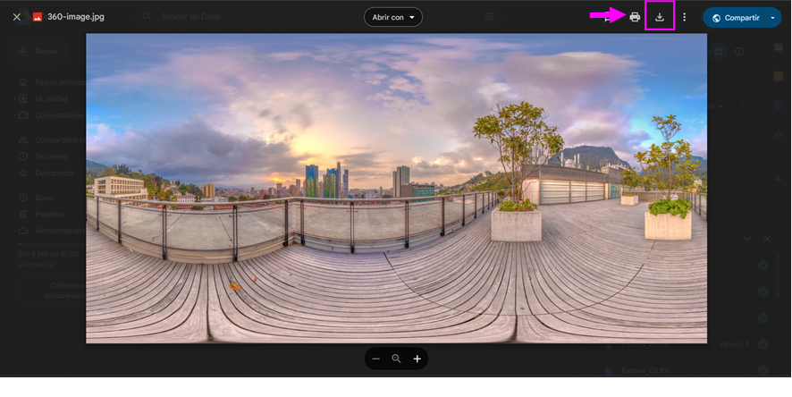 - El primer paso será importar una imágen 360 que podamos usar como SkyBox en nuestra escena. Para eso descargaremos la siguiente imágen, tal y como previamente descargamos nuestro modelo: https://drive.google.com/file/d/12_MNRVl_sBhYAzX8agUY64pPtiTfZsuZ/view?usp=sharing