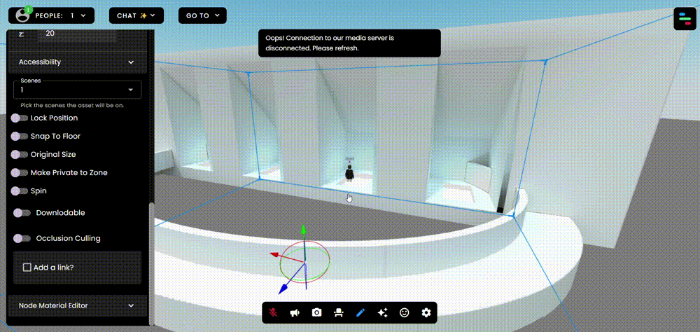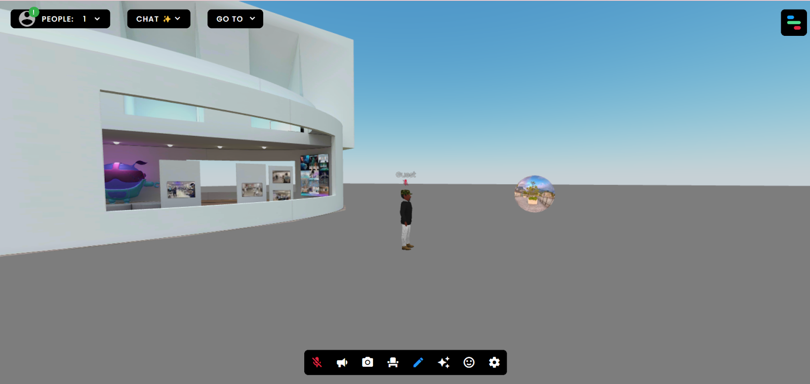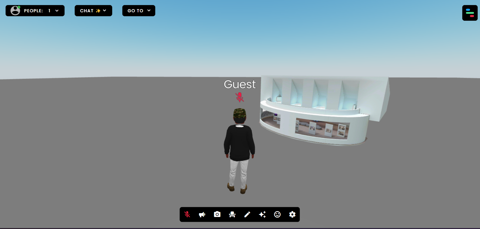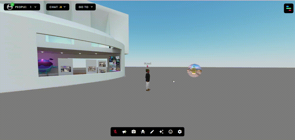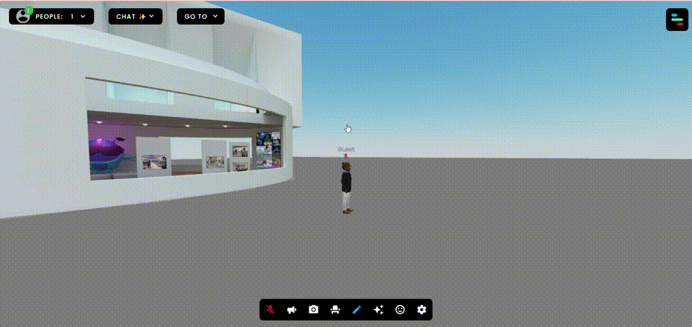 - Nuestro metaverso cargará y se verpa así, en esta plataforma podremos explorar al mismo tiempo que editamos, por lo que en nuestra pantalla de inicio se verá las opciones de cámara y microfono los cuales podremos activar o desactivar segun