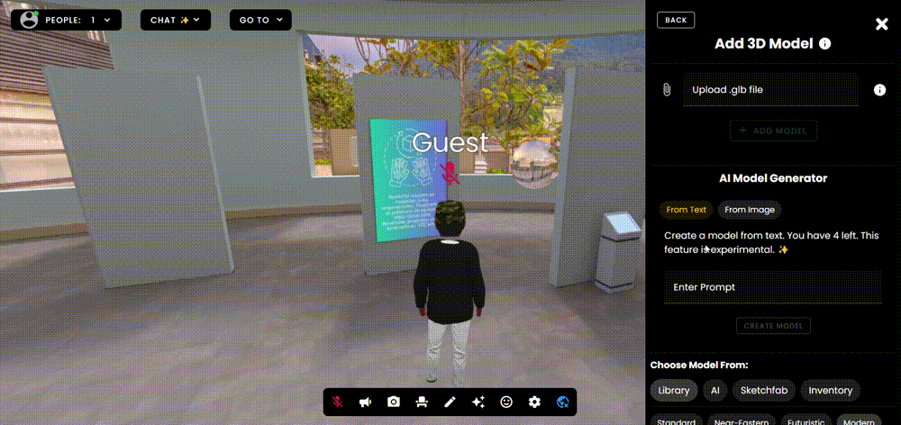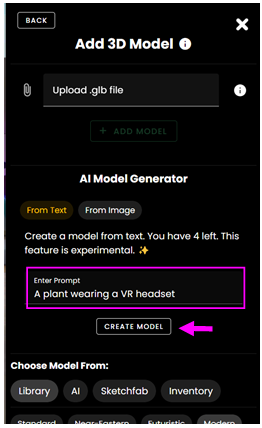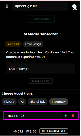 Otra opción para importar modelos en Frame VR es a través de Inteligencia Artificial. Frame VR permite generar una variedad de modelos 3D utilizando prompts e inteligencia artificial generativa, lo que facilita la creación de objetos personalizados sin necesidad de diseñarlos manualmente. Esta herramienta es ideal para quienes desean explorar opciones creativas o añadir detalles únicos a sus entornos de manera rápida.