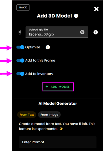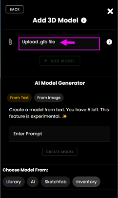- En el costado derecho de nuestra ventana se nos abrirá un Menú llamado "Add 3D Model". Acá daremos click sobre el texto que dice Upload.glb file: