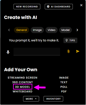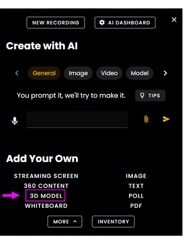 Al hacer clic, se abrirá un menú desde el cual podremos agregar diversos tipos de contenido, como imágenes, videos y modelos 3D. En este caso, vamos a importar nuestro modelo 3D base. Para ello, dirígete al apartado "Add Your Own", donde podrás cargar contenido personalizado, incluidos modelos 3D. Selecciona la opción "3D MODEL" para iniciar el proceso de importación de tu modelo en Frame VR.