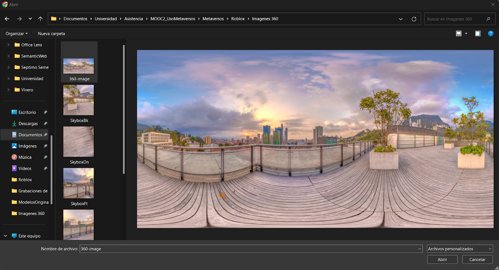 Lo último que aprenderemos será cómo agregar una imagen 360° como skybox en nuestro metaverso. Un skybox es una textura o imagen que se coloca alrededor de todo el entorno virtual para crear la ilusión de un horizonte.
