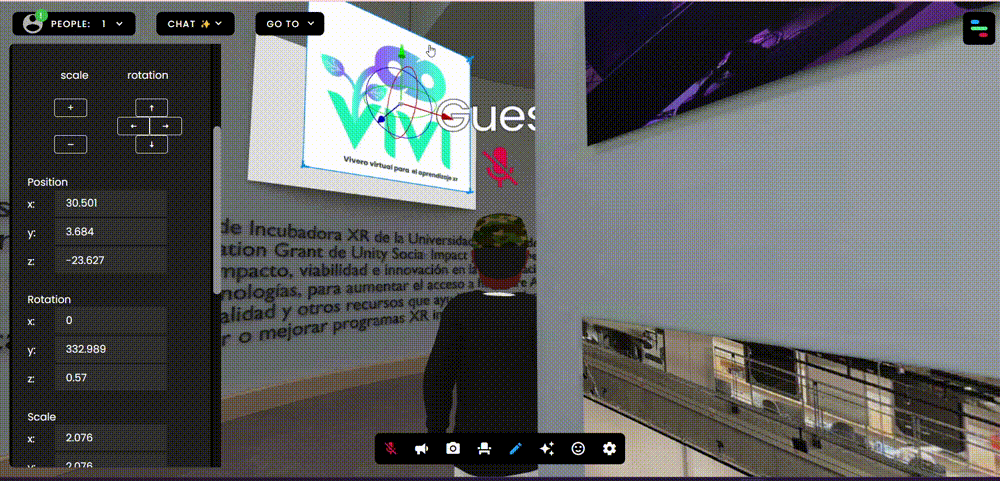 - Listo, ya tenemos nuestra foto importada en nuestro Metaverso. Con las herramientas aprendidas anteriormente podremos modificar el tamaño y la posición de esta. En este caso la acomodaremos para que quede en una de las paredes de nuestro modelo.