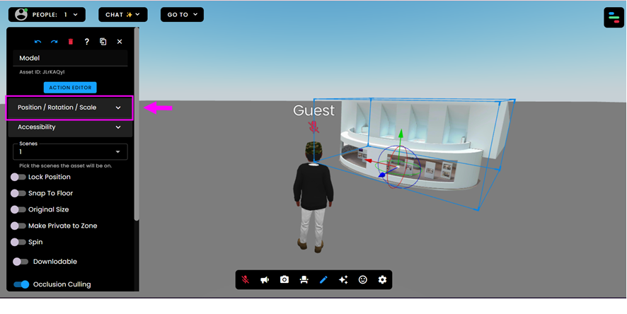 - Ahora daremos click sobre el modelo. Veremos que se abrirá una venta de propiedades y edición de nuestro modelo en la parte izquierda de la pantalla. Allí buscaremos la opción que se llama Position/ Rotation/ Scale y extenderemos para ver todas sus opciones (Para expandirlo daremos click en el triangulo que apunta hacia abajo)